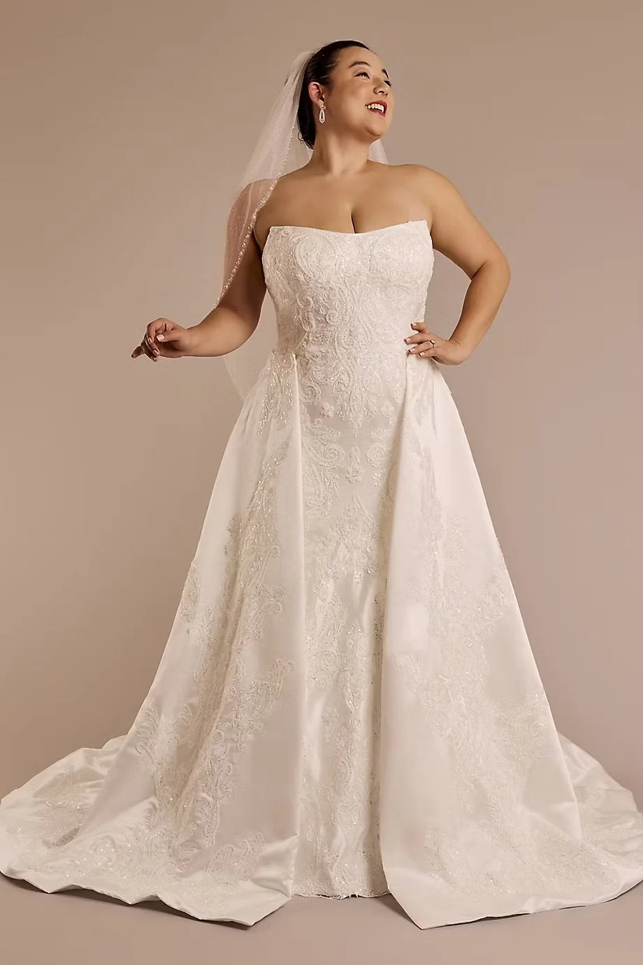 Customization note: Most David’s Bridal styles are customizable — you can change fabric, sizing, and often add a detachable overskirt or train.