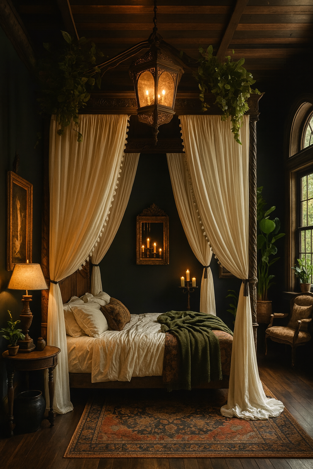Antique details, layered textures, and warm lighting bring timeless charm to this style. Vintage rugs, carved furniture, and soft draped fabrics make the room feel both romantic and mystical.